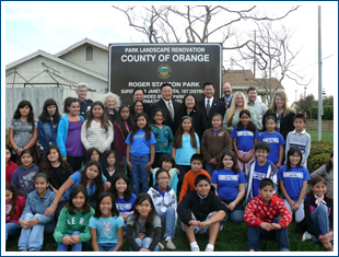 At the Ribbon Cutting Ceremony at Roger Stanton Park, Supervisor Janet Nguyen and members of the county staff are joined by a lot of kids who are excited about the new park.