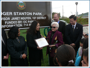 Westminster Mayor Margie Rice presents Supervisor Janet Nguyen with a Certificate of Recognition in honor of the efforts of the Supervisor and the County in the re-opening of the Roger Stanton Neighborhood Park.
